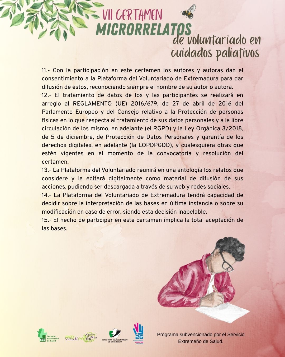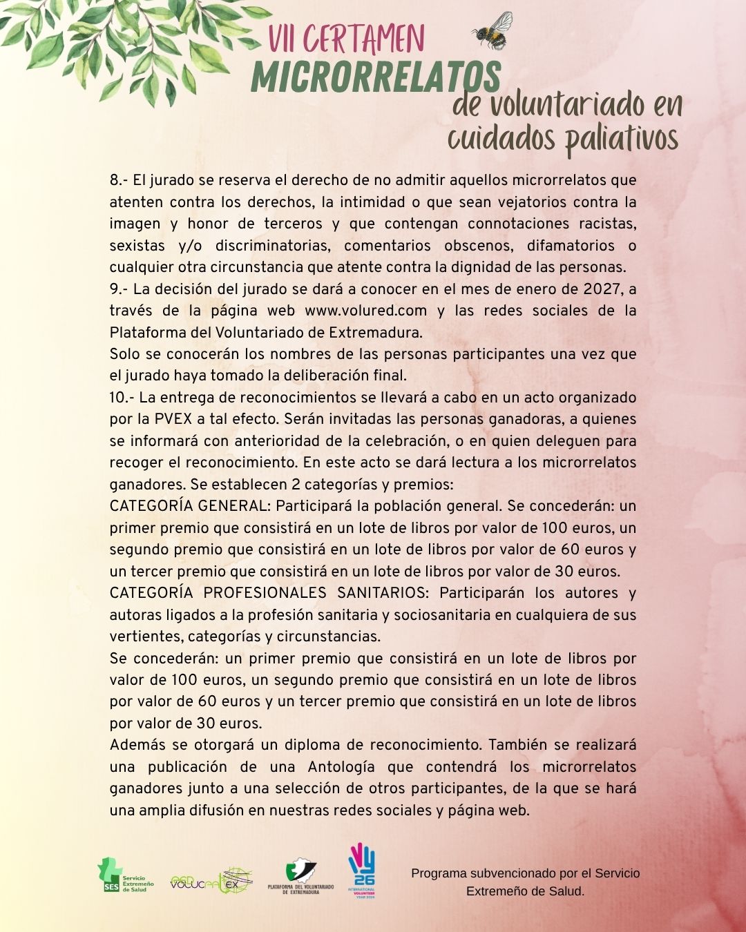 VII Certamen de Microrrelatos de Voluntariado en Cuidados Paliativos!! Podrán enviar sus microrrelatos de hasta 200 palabras personas mayores de 18 años, con un único relato por participante y tema: el voluntariado en cuidados paliativos. Deberá estar escrito en castellano y ser inédito. Se establecen dos categorías: categoría general o categoría profesional sanitario/sociosanitario.